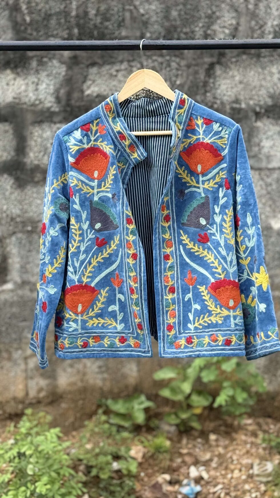 Luxurious velvet jacket featuring intricate Suzani embroidery. Perfect blend of elegance and tradition โ€” ideal for festive and ethnic occasions.