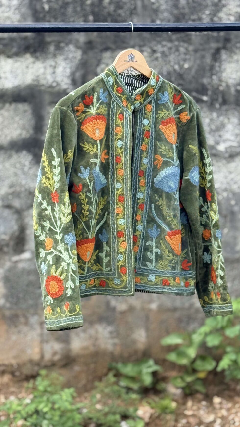 Womens Olive Green Velvet Embroidered Jacket with Floral Design